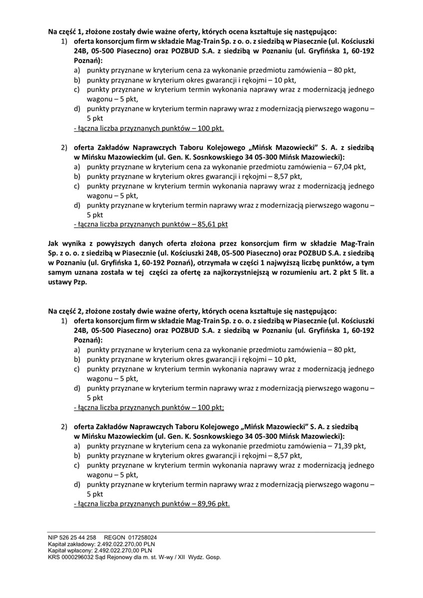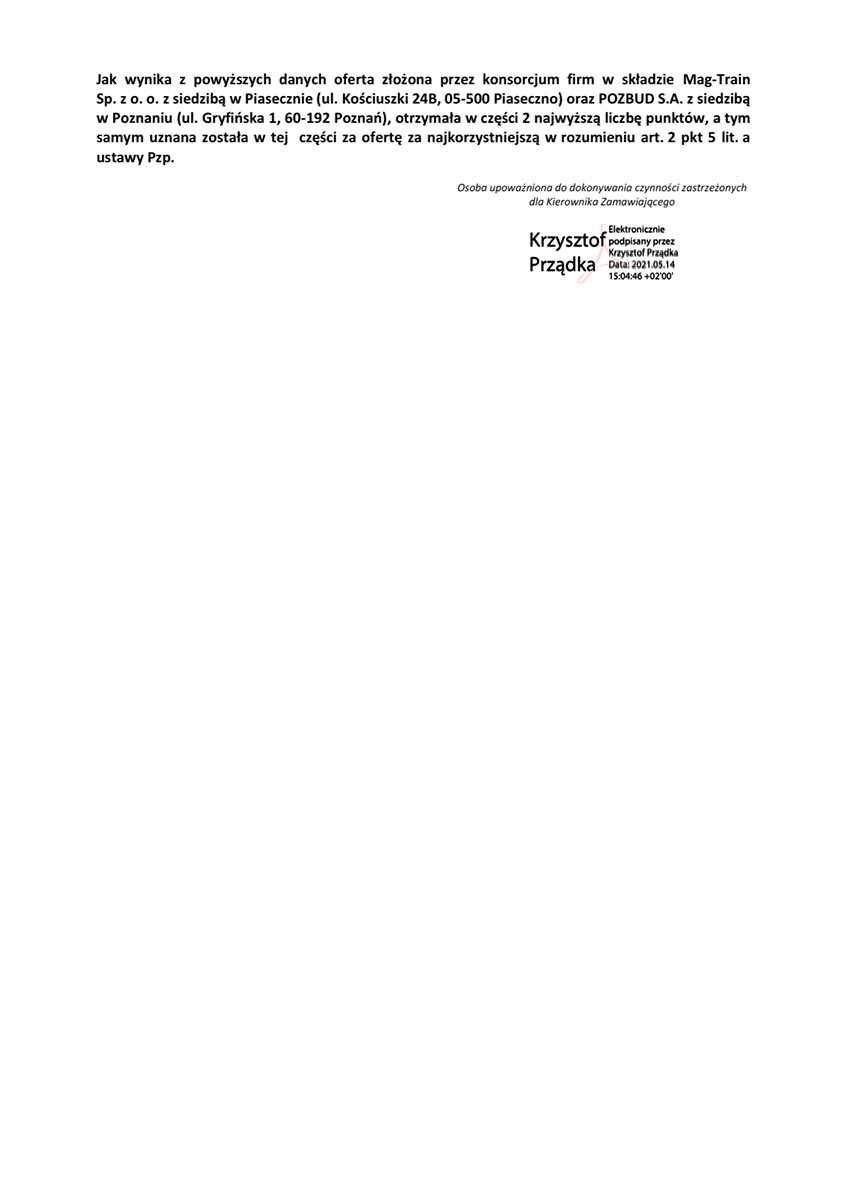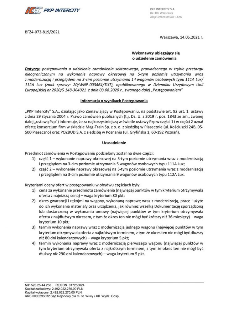„PKP Intercity” S.A., działając jako Zamawiający w Postępowaniu, na podstawie art. 92 ust. 1 ustawy z dnia 29 stycznia 2004 r. Prawo zamówień publicznych (t.j. Dz. II. z 2019 r. poz. 1843 ze zm., zwanej dalej „ustawą Pzp”) informuje, że za najkorzystniejszą w świetle ustawy Pzp w części 1 i w części 2 uznał ofertę konsorcjum firm w składzie Mag-Train Sp. z o. o. z siedzibą w Piasecznie (ul. Kościuszki 24B, 05-500 Piaseczno) oraz POZBUD S.A. z siedzibą w Poznaniu (ul. Gryfińska 1, 60-192 Poznań).
