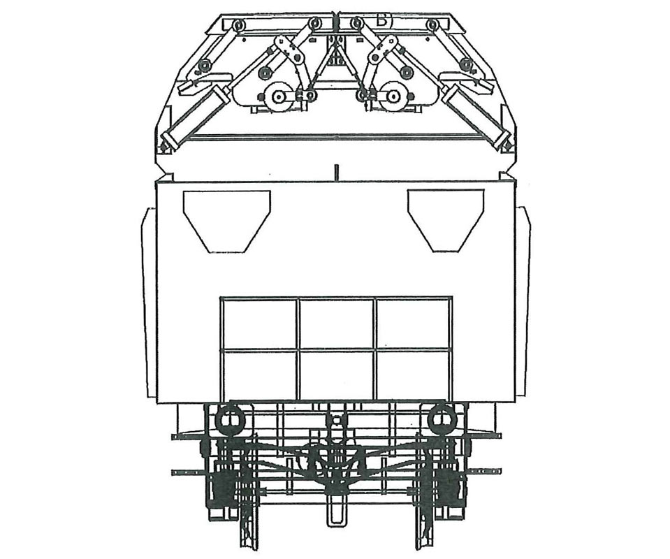 Daneben wurde eine Zeichnung mit der Ansicht einer der Stirnwände hinzugefügt. Sie zeigt die Komponenten des Verlademechanismus, bestehend aus: Zugmittel, pneumatische Stellmotoren und Klappen-Notöffnungssystem.